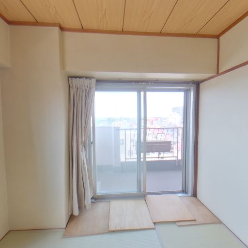 採光と眺望(確度86%):バルコニーに面した掃き出し窓と腰高窓があり、外光がしっかり入る。遠景の建物が見え、抜け感がある。