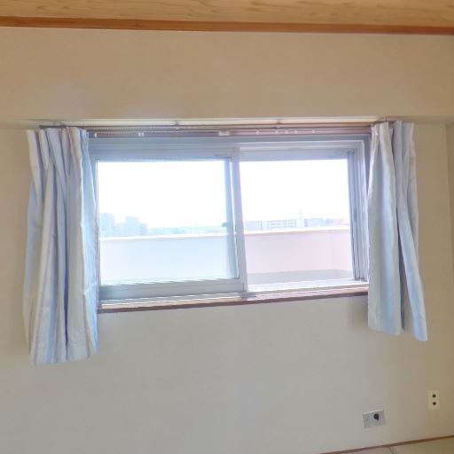 採光(確度82%):窓が2枚あり、明るい自然光が入っている。窓枠の高さは腰高程度で外のバルコニー手すりが見える。