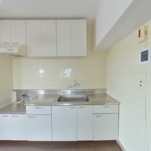 キッチンは広めの作業スペース(確度78%):長いカウンターと上下収納があり、2口以上のコンロが置けそうなスペース。