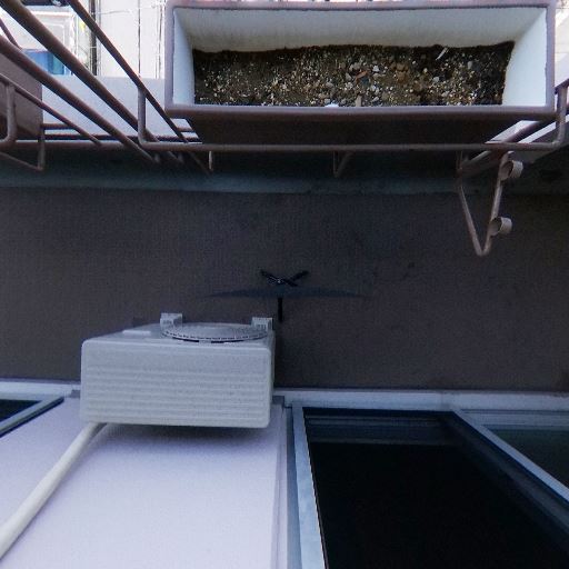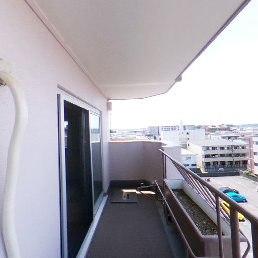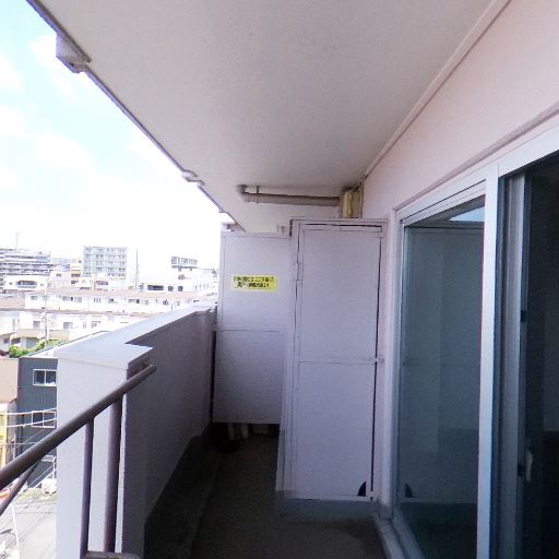 共用設備ボックスの存在(確度67%):バルコニー奥に大きめの設備ボックス(メーターボックス等)があり、奥行きが局所的に狭くなっている。