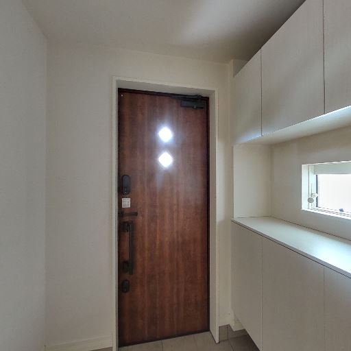 • 玄関ドアに採光部がある(確度75%):玄関ドア本体に小さな採光部があり、外光をわずかに取り込める仕様に見える。