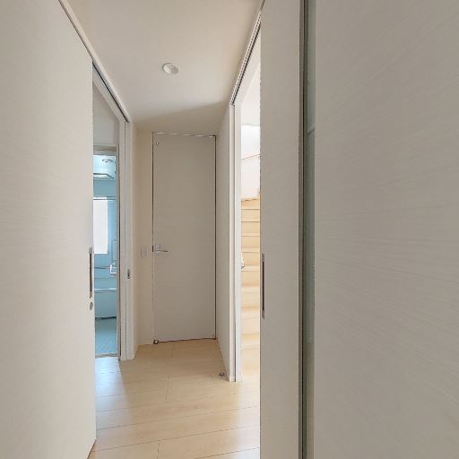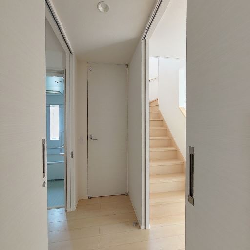 • 白基調で清潔感のある内装(確度87%):壁・建具とも白系で統一され、床も明るい木目調のため、全体として清潔感が強い。目立つ大きな汚れや傷は画像上では確認しにくい。