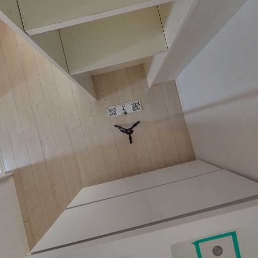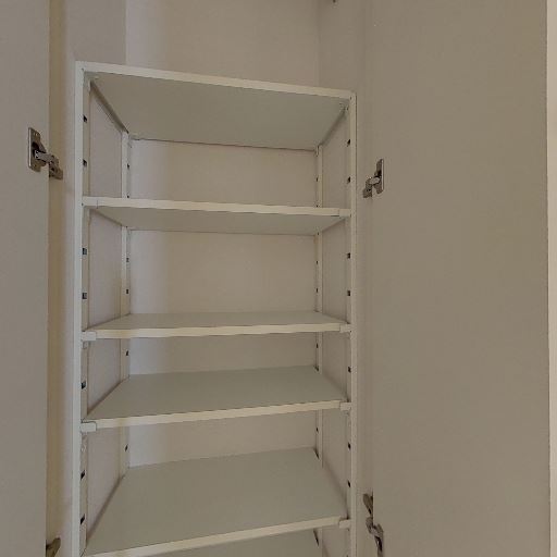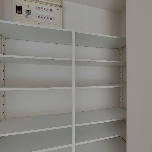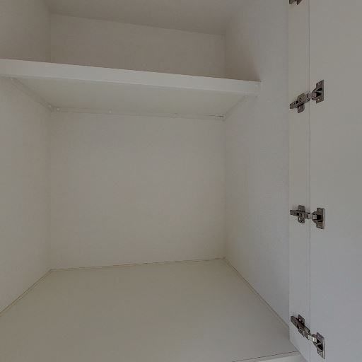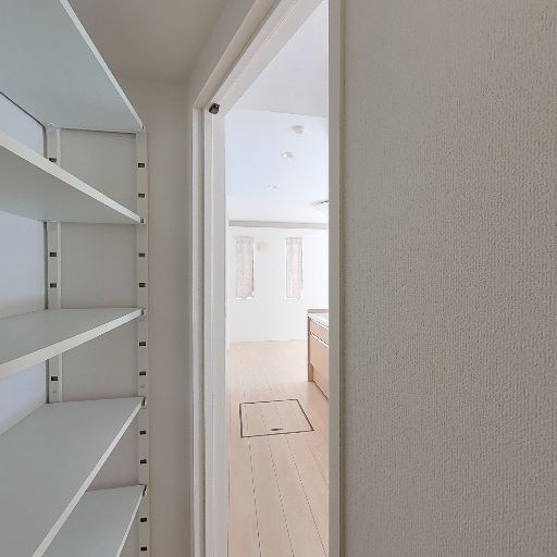 • 床は明るい色で圧迫感が少ない(確度80%):床材が淡い木目調で、収納内の白い壁と合わせて全体が明るく見える。閉鎖的になりやすい収納空間としては圧迫感を抑えている。
