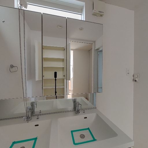 • 洗面台が新しく清潔感がある(確度91%):白基調の洗面化粧台と三面鏡が設置されており、全体として清潔感のある印象を受ける。水栓まわりも比較的すっきりして見える。
