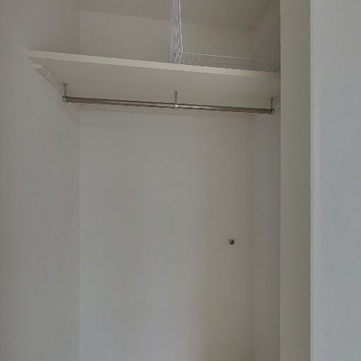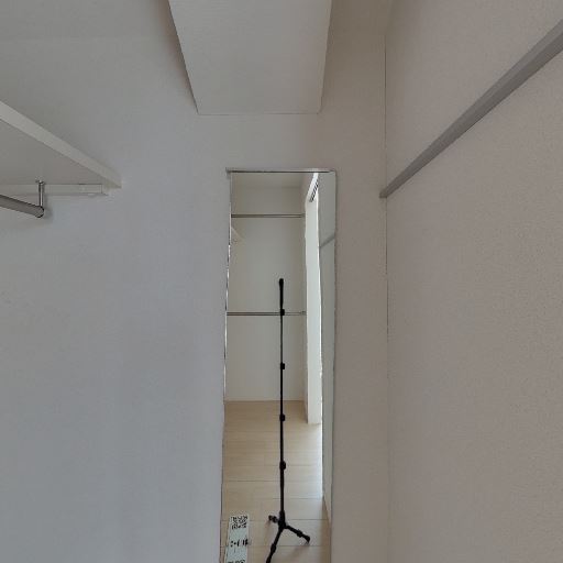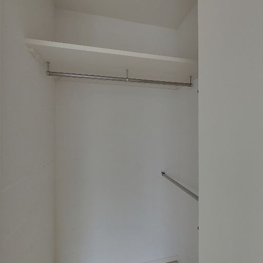 • 収納力の高いウォークインクローゼット(確度94%):左右の壁面にハンガーパイプと棚が設けられており、衣類を多く掛けながら上部にも収納できる構成になっている。奥行きも一定程度あり、ウォークインタイプの収納として使いやすそう。
