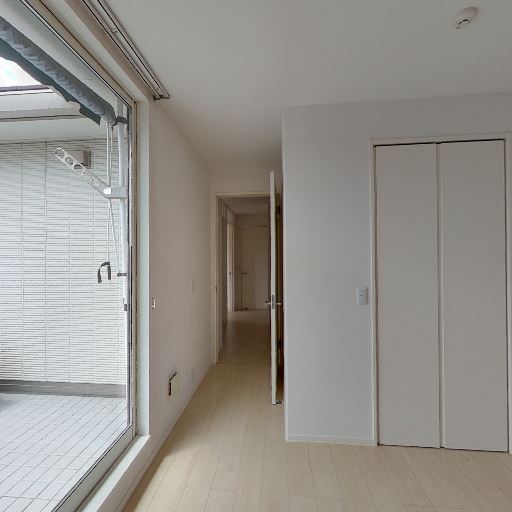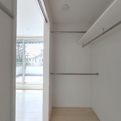 • 主室からの採光が入りやすい(確度85%):クローゼットの開口部越しに大きな掃き出し窓が見えており、この収納空間にも主室から自然光が届くと考えられる。完全な暗所収納ではなさそう。