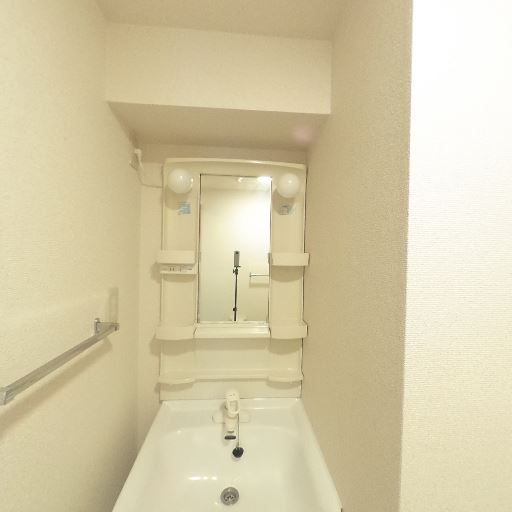 3点ユニットバスではなくシャワールーム+浴槽タイプ(確度80%):バスタブとシャワーが確認でき、トイレは同空間に見当たらない。