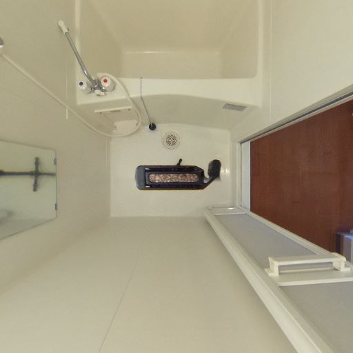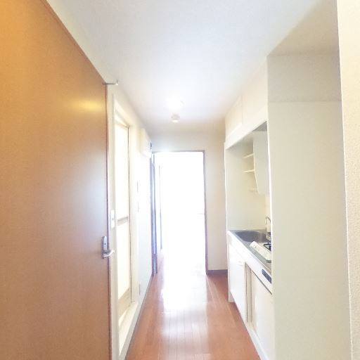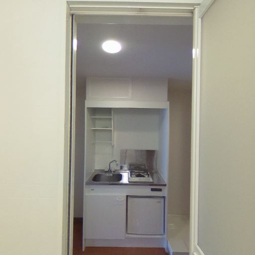 キッチンと浴室が近接(確度79%):浴室の引き戸の先にコンパクトなキッチンが直結して見える。