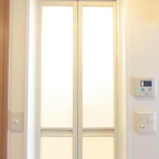 室内扉のすりガラス(確度80%):居室側への扉は採光のできるすりガラスタイプで、廊下側も明るくなる。