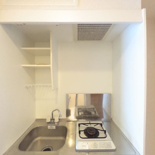 ミニキッチンの設置(確度80%):廊下沿いに単身向けのコンパクトなキッチン・吊り棚がある。