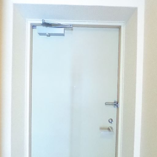 玄関ドアとドアクローザー(確度79%):玄関扉は金属製でドアクローザー付き。ポスト口とダブルロック風の金物が見える。