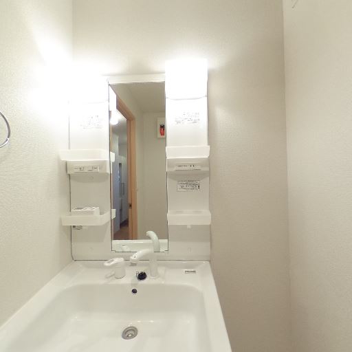 独立洗面台(確度86%):鏡付きの独立洗面台があり、左右に収納トレーと上部照明が付いている。水栓は単水栓タイプに見える。