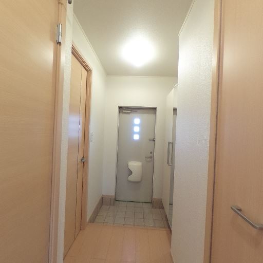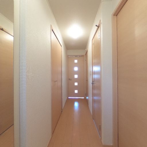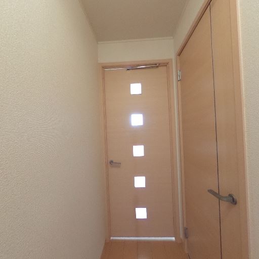 室内ドアと廊下の明るい木目で統一感(確度74%):各方向に同系色の木目ドアと巾木が並び、明るい色で統一されている。