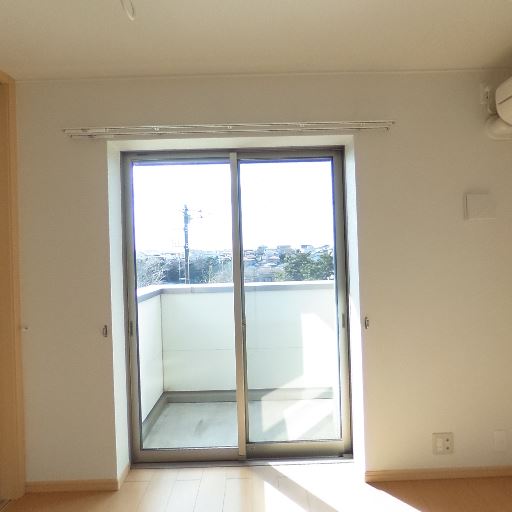 ベランダ付き(確度86%):窓の外に手すりと床が見える小さなバルコニーがある。