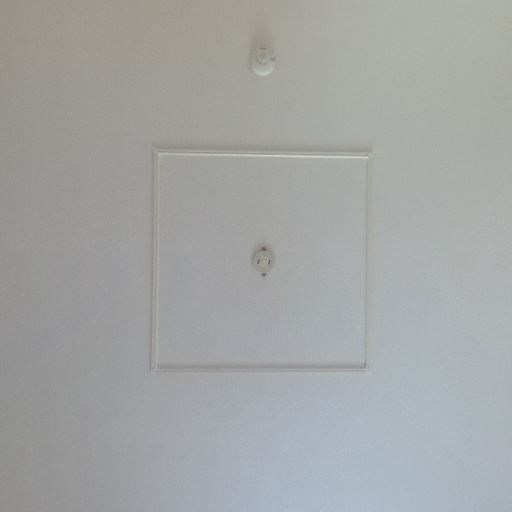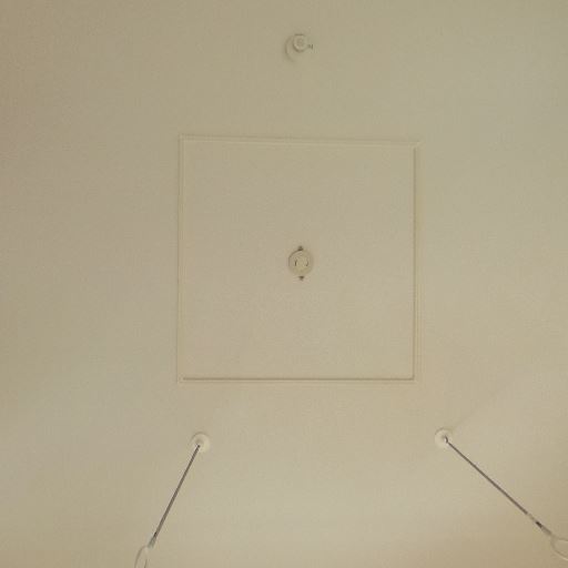 天井点検口と火災報知器(確度80%):天井中央付近に点検口、近くに感知器が見える。一般的な設置で異常は見当たらない。