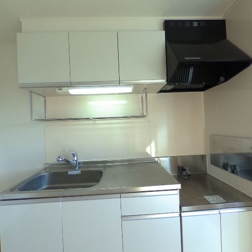 キッチンの設備と清潔感(確度83%):吊戸棚・換気扇・シンク一体型のステンレス天板があり、全体的に清潔。手元灯も確認できる。