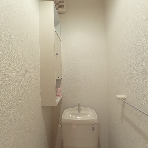 収納のあり(確度82%):便器横に壁付けの吊戸棚(オープン棚+扉付き)があり、トイレットペーパー等をしまえそう。