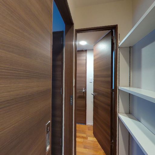 • 廊下の造り付け収納(確度84%):壁面に可動棚のオープン収納がある。ドア近くに配置され、日用品や掃除道具の置き場として使えそう。