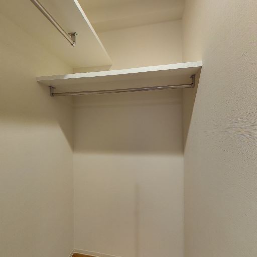 • ウォークインクローゼットの収納力(確度87%):ハンガーパイプと上部棚があり、衣類を掛けつつバッグや小物も置ける構成。可動棚も一部に確認でき、分類収納がしやすい。