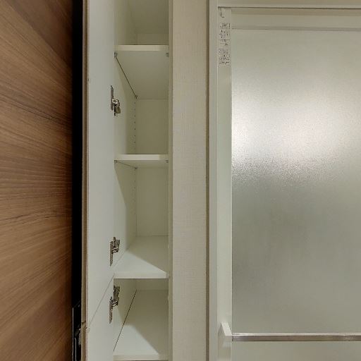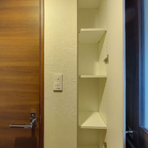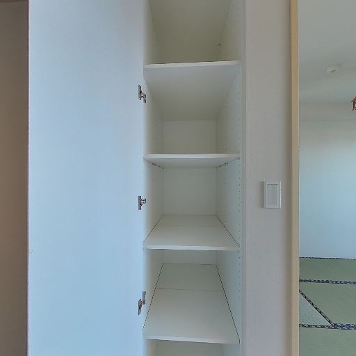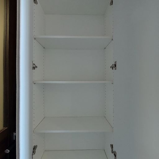 • 可動棚の収納スペース(確度90%):壁面に可動棚が4段以上ある収納が確認できる。掃除道具やリネン、日用品のストックを整理しやすい。