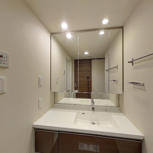 • 照明の明るさ(確度80%):天井ダウンライトと鏡上の反射で洗面所全体が明るい。