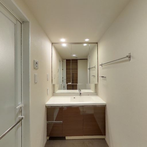 • 浴室扉とタオルバー(確度78%):すりガラスの浴室扉があり、洗面横の壁にタオルバーが取り付けられている。