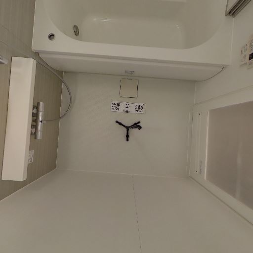 • 洗濯機置き場の有無(確度90%):床面に洗濯機パンと排水口、壁面に給水栓・コンセントが確認できる。