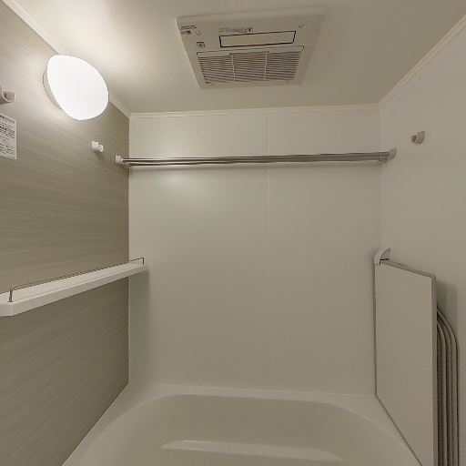 • 浴室乾燥機・換気機能あり(確度90%):天井に浴室換気乾燥機の本体と吹出口が見える。洗濯物の乾燥やカビ対策に有利。