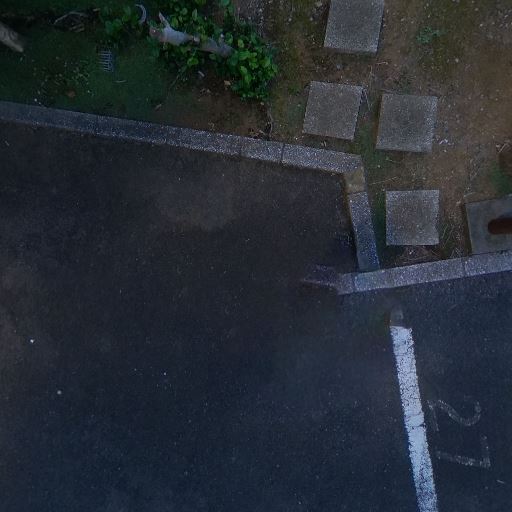 • 駐車場と敷地内通路あり(確度86%):建物前面にアスファルトの駐車スペースと歩行用の飛び石通路が見える。