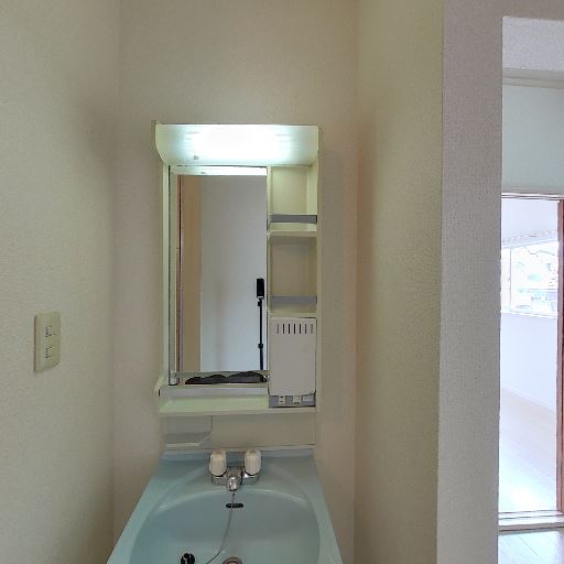 • 洗面台に鏡と収納があり身支度しやすそう(確度92%):洗面台正面にミラーキャビネットと小物置きがあり、洗面まわりで日用品をまとめて使いやすい構成に見える。