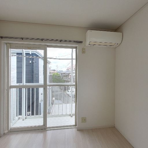 • エアコン設置済み(確度97%):掃き出し窓の上部付近に壁掛けエアコンが既に設置されている。