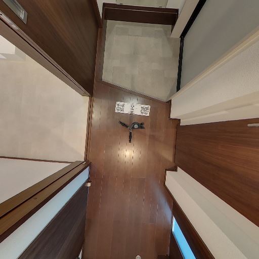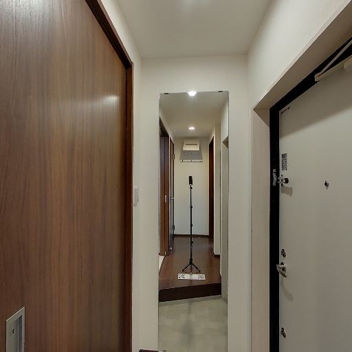 玄関からの動線が一直線でコンパクト(確度78%):玄関から細い廊下が続き、正面側に洗面・浴室が見える。左右に居室や水回りの扉が配置されたレイアウトで、無駄な行き止まりが少ない。