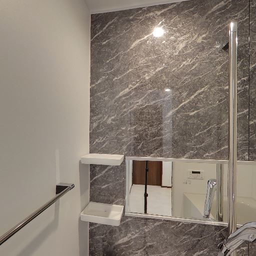 浴室が新しめで清潔感あり(確度76%):浴室の壁面パネルや水栓周りがきれいで、劣化やカビの目立つ箇所は見当たらない。