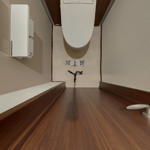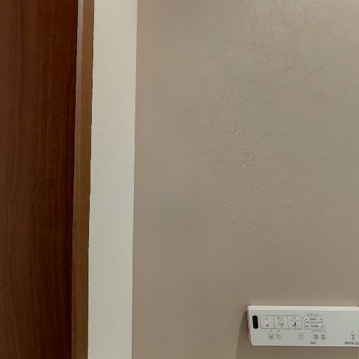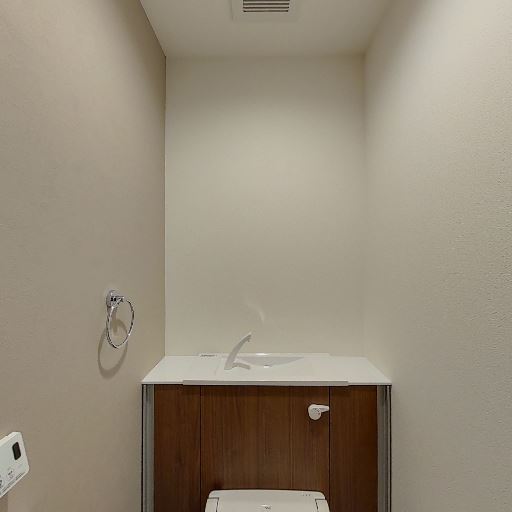 独立型のトイレ空間(確度95%):便器・ペーパーホルダー・リモコン操作パネルがあり、個室トイレであることが分かる。