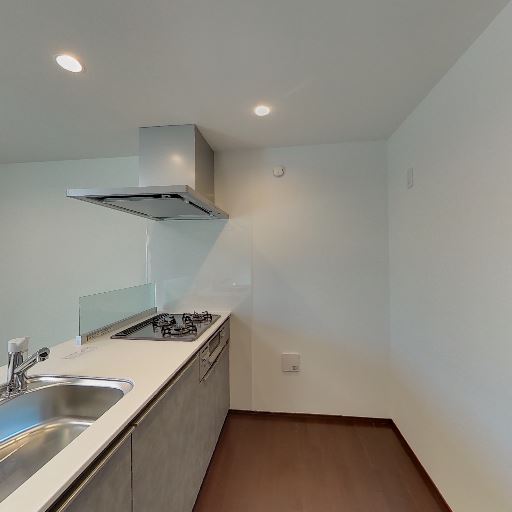 対面キッチンと設備(確度86%):シンク一体型のカウンターとガスコンロ、レンジフードが見える対面式キッチン。ダウンライトで手元も明るい。