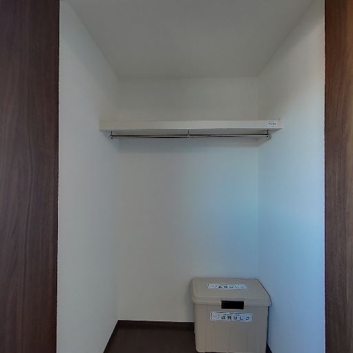 クローゼット収納(確度86%):奥行きのあるクローゼットにハンガーパイプと上部棚が備わっている。床置き収納ボックスも置けるスペースがある。