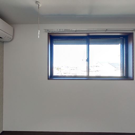 エアコン設置済み(確度90%):窓横の壁面にエアコン本体が見える。