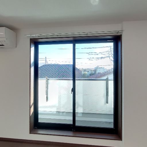 採光と窓(確度78%):腰高サイズの引き違い窓があり、外が明るく見える。窓枠上にはカーテンレールが設置済み。