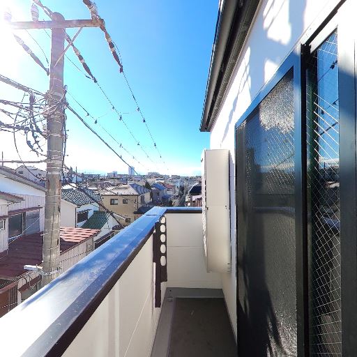 バルコニーからの抜け感(確度82%):前面は低層住宅が多く、視界が開けており遠くまで見渡せる。