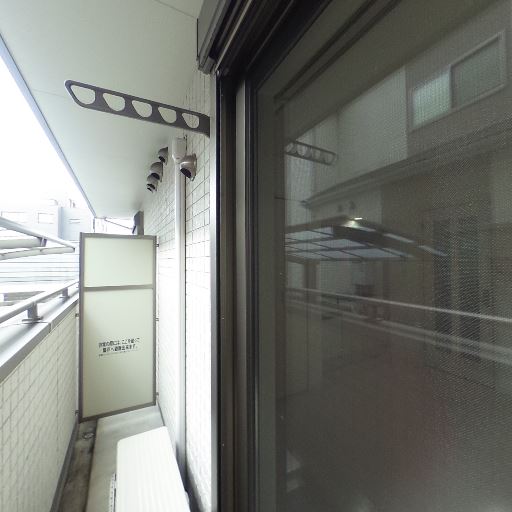 バルコニーの奥行きと使い勝手(確度78%):手すり内側に室外機が置ける幅があり、物干し金物も備わっている。通路としても歩ける程度の奥行き。