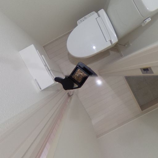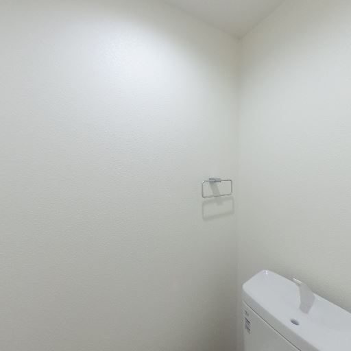 収納・小物掛け(確度64%):壁にトイレットペーパーホルダーもしくはタオル掛けの金具が見えるが、収納棚は見当たらない。