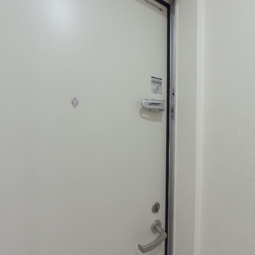 玄関ドアと防犯設備(確度83%):内開きの玄関ドアにドアスコープ・チェーン(ドアガード)があり、基本的な防犯機能が備わっている。