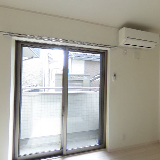 エアコン設置済み(確度95%):掃き出し窓の上部に壁掛けエアコンが取り付けられている。
