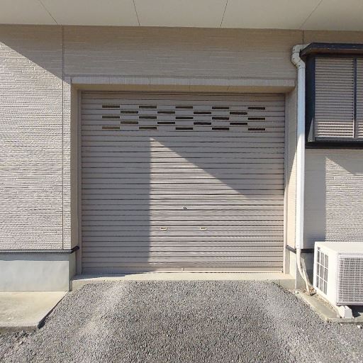 シャッター付きガレージ(または倉庫)前の区画(確度86%):建物外壁に面してシャッターがあり、前面は砂利敷のスペース。車の出し入れや物置きに使えると推測。