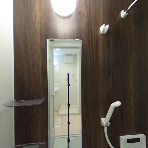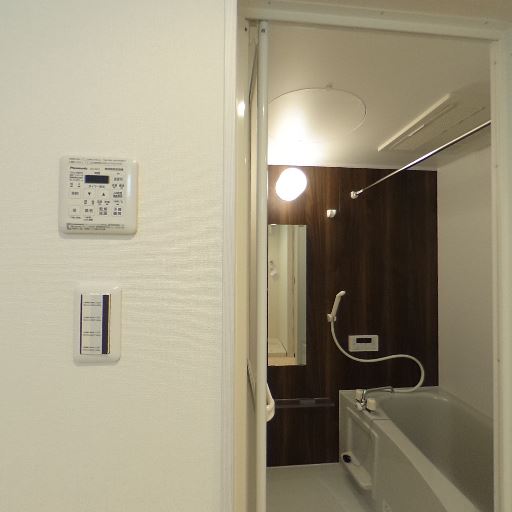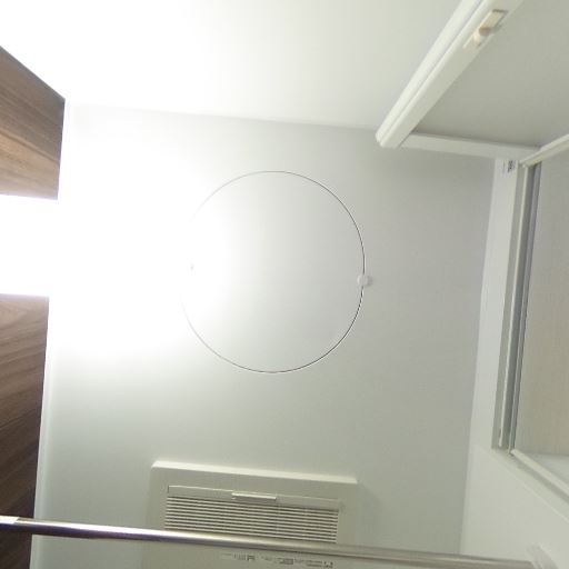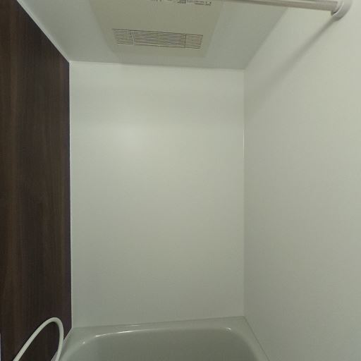 浴室乾燥・換気設備あり(確度88%):天井に浴室乾燥機と思われる換気ユニットが設置されている。物干しバーもあり、洗濯物の室内乾燥が可能。