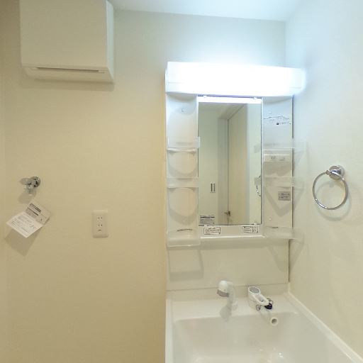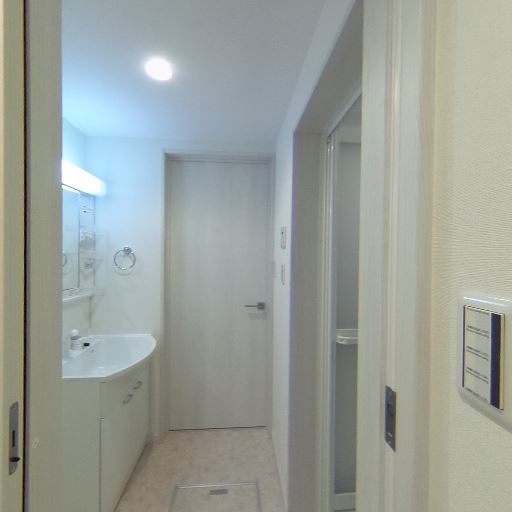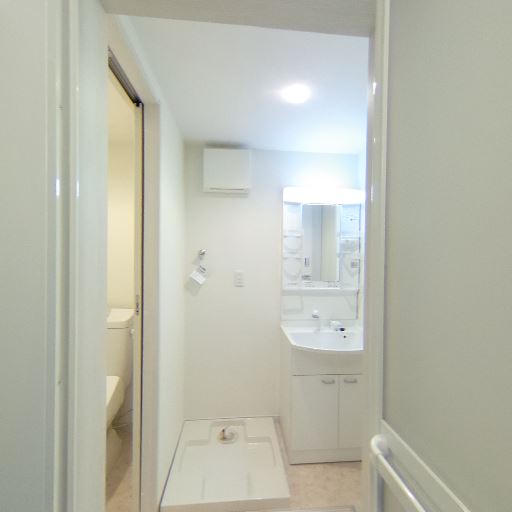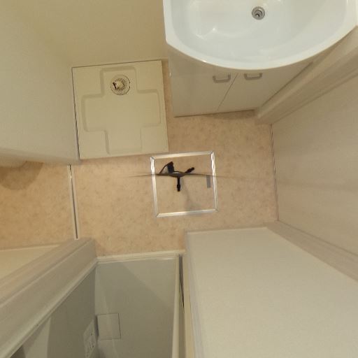 室内物干し・ランドリースペース(確度80%):床面に洗濯機置き場パンがあり、洗面台近くに設置できる。