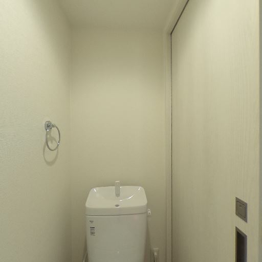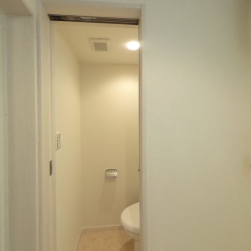独立トイレの様子(確度86%):コンパクトな個室トイレ。引き戸で出入りしやすい。壁は明るいクロスで、床はクッションフロア。タオルリングと換気口、天井照明あり。