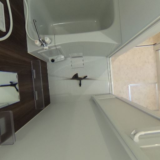 浴室が隣接し回遊しやすい動線(確度83%):洗面室からそのまま浴室にアクセスでき、浴室内はダーク木目パネルで手すり・鏡・追い焚き操作盤らしき設備が見える。
