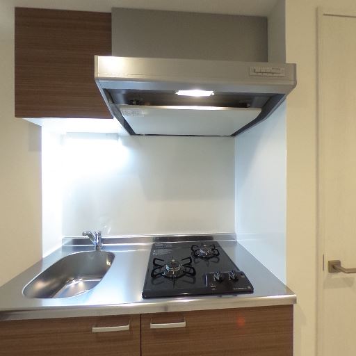 キッチン設備の充実(確度90%):2口ガスコンロとレンジフード、ステンレス天板とシンクがコンパクトにまとまり、吊戸棚もある。