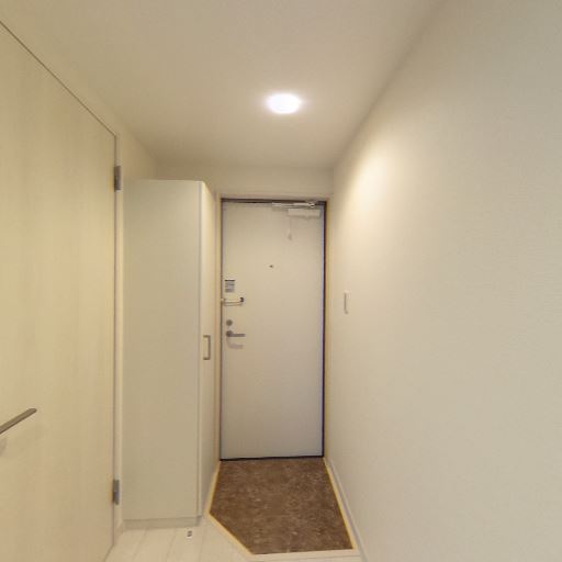 玄関まわりの収納と明るさ(確度82%):玄関正面にシューズボックスがあり、天井ダウンライトで明るい。